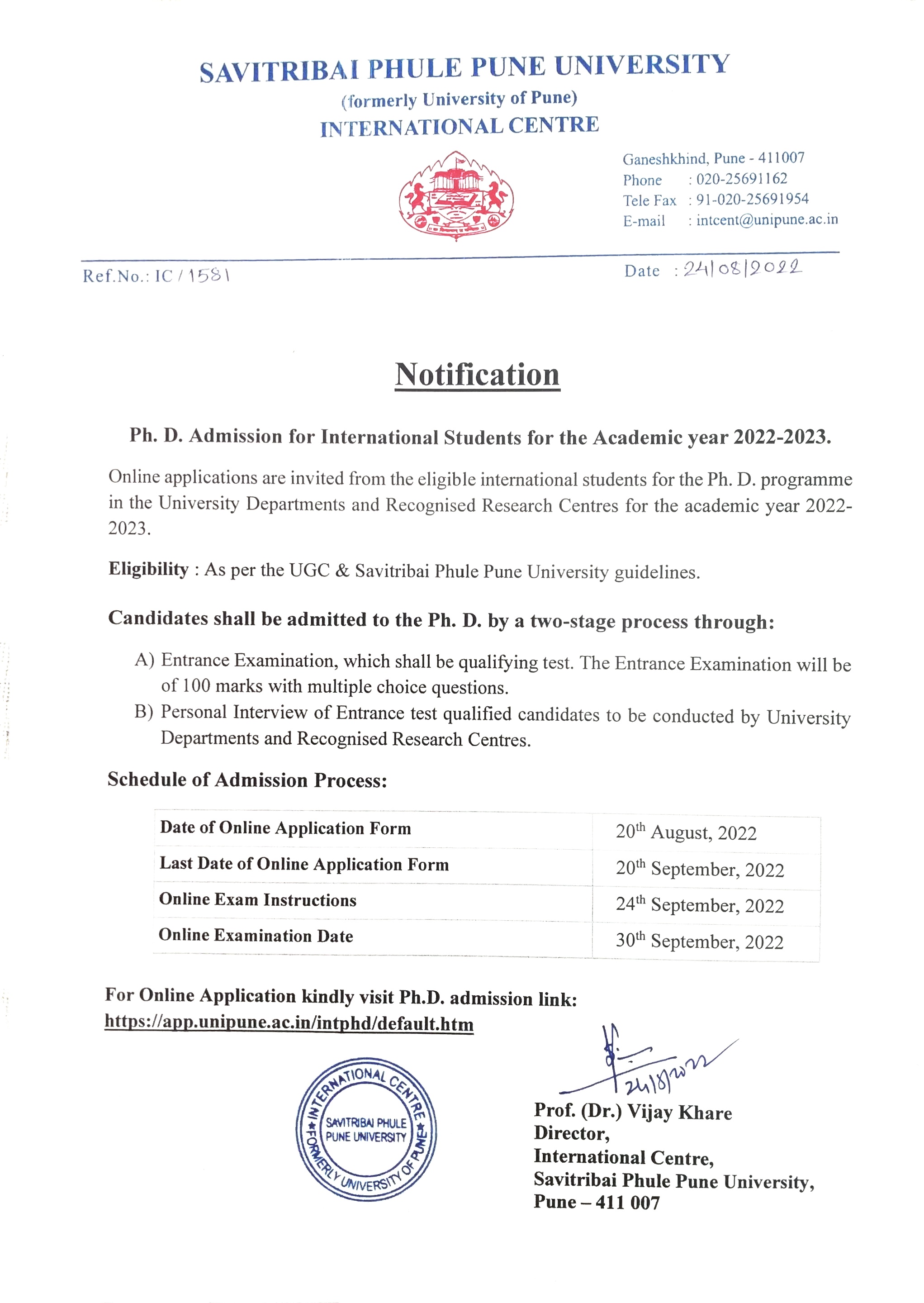 Notice for Ph. D. Entrance Exam of International Students for the Academic year 2022-2023.